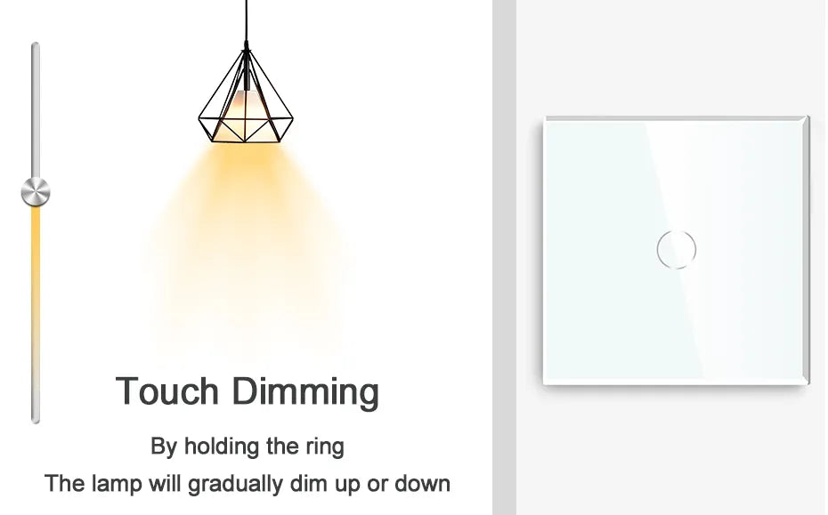 - The switch can be used to turn lights on/off or dim the light intensity by touching the front glass panel of the dimmer switch.